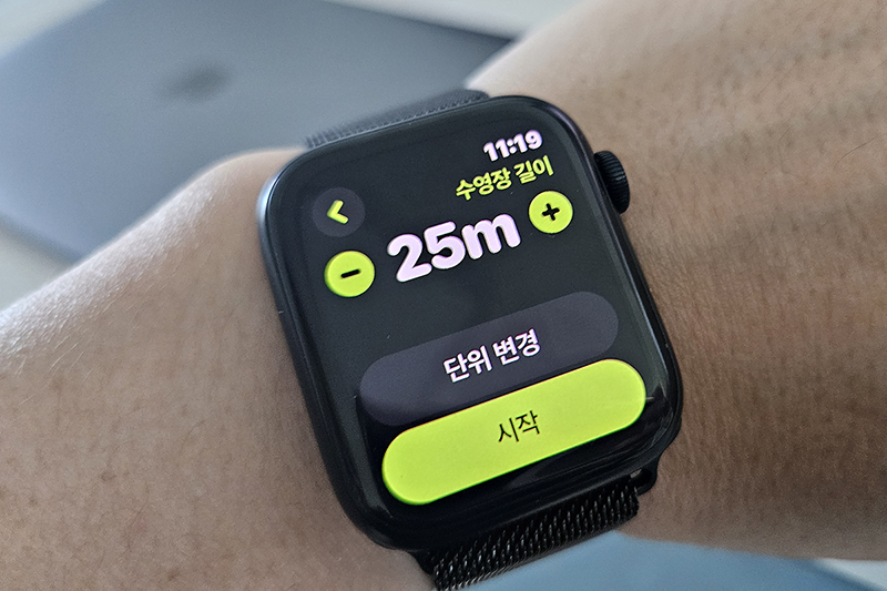 ‘수영(수영장)’ 모드를 선택하면 수영장 길이 설정 기능이 활성화됩니다. 예를 들어 수영장 길이가 25m라면 그 길이를 설정해 줌으로써 애플워치는 왕복 횟수를 계산하고 거리 데이터를 보다 정확하게 제공합니다.
