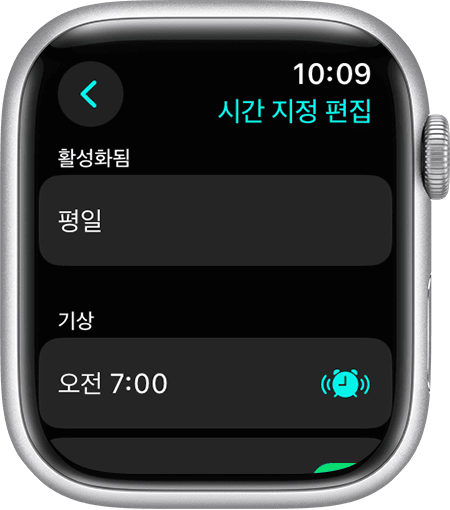 - '활성화됨'을 탭한 다음 수면 시간을 설정할 요일을 탭합니다.